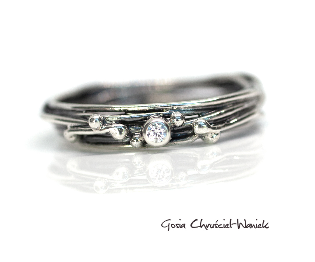 Srebrny pierścionek w formie obrączki nawiązujący formą do ptasiego gniazda. Kamień – moissanit ma średnicę 2mm.