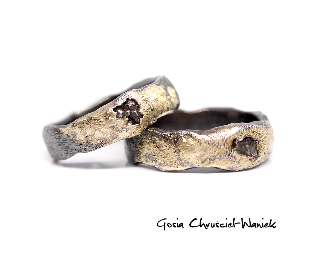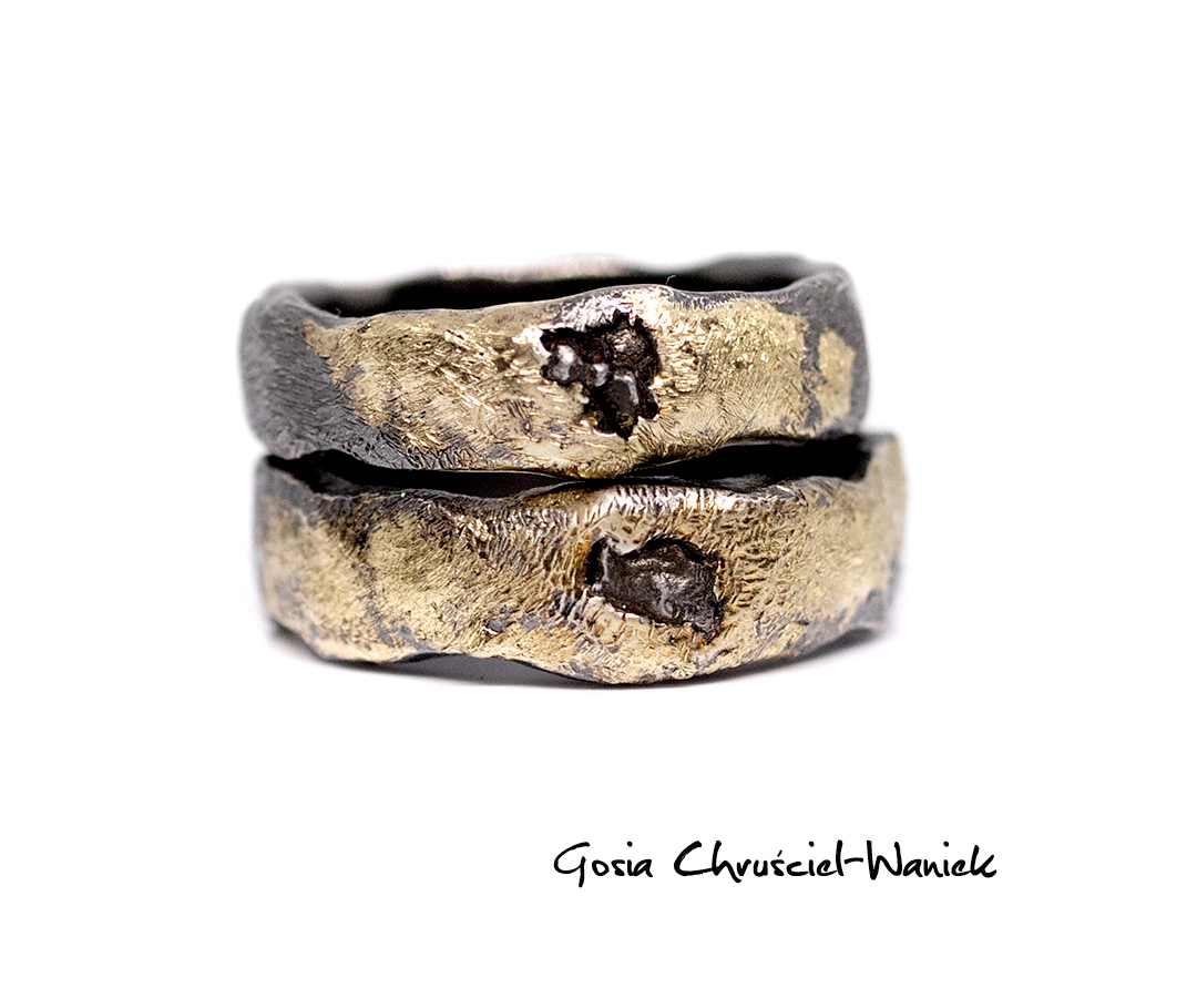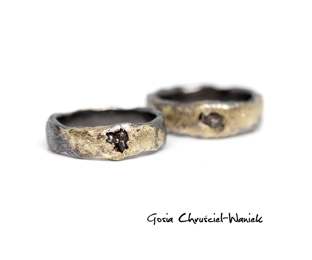 Obrączki wykonane ze srebra pr. 925, z zatopionym meteorytem, zdobione złotem pr. 585.