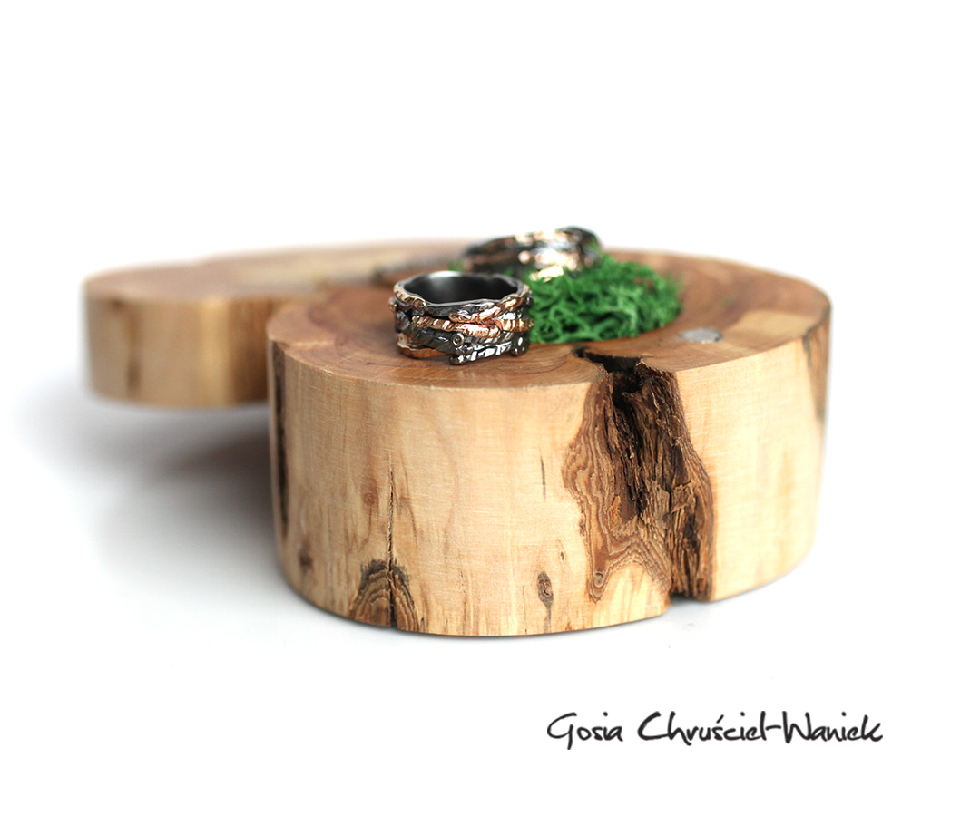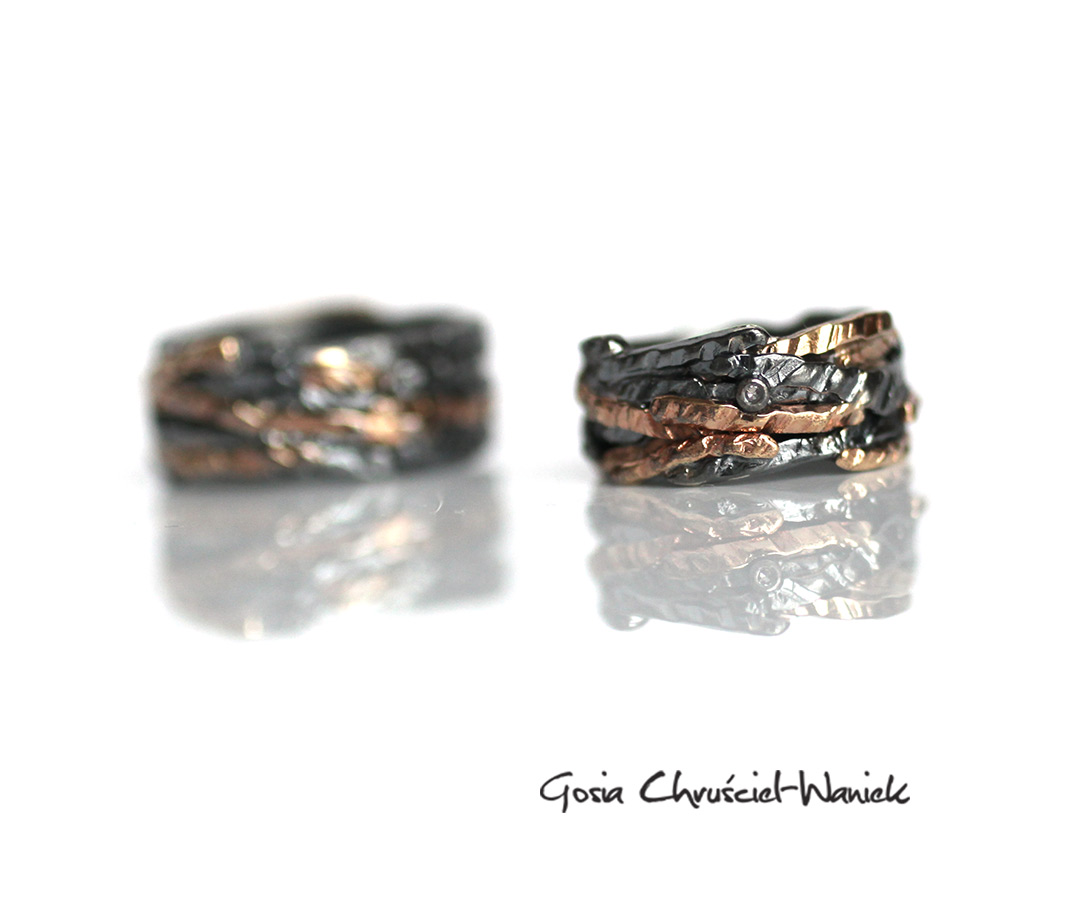 Piękne, niesymetryczne, organiczne. Szerokość obrączek ok 8-9mm (damska) i 9-10mm – męska.