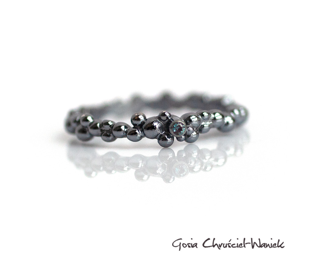 Pierścionek/obrączka z kolekcji Symbiosis wykonany ze srebra pr. 925 aleksandrytem o średnicy 1,5mm.