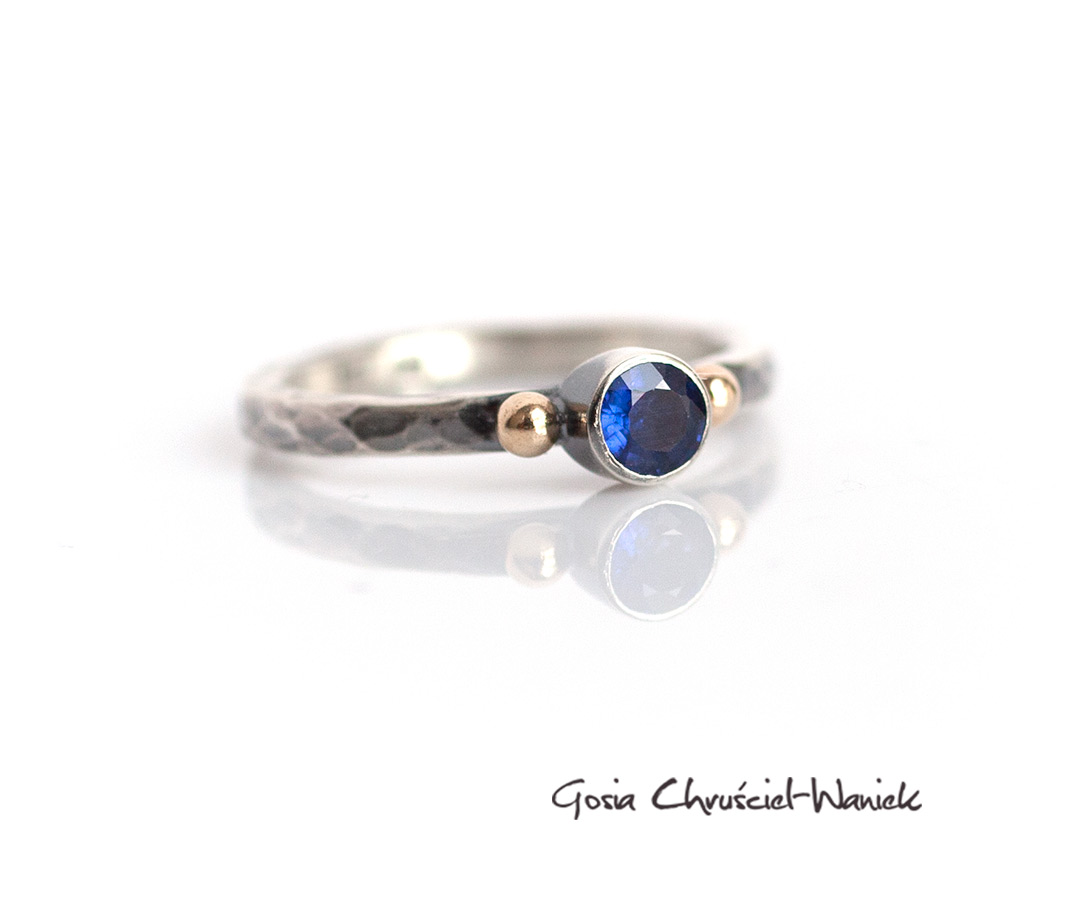Pierścionek wykonany na zamówienie ze srebra pr. 925, ze złotem pr. 585 i szafirem o średnicy 4mm.