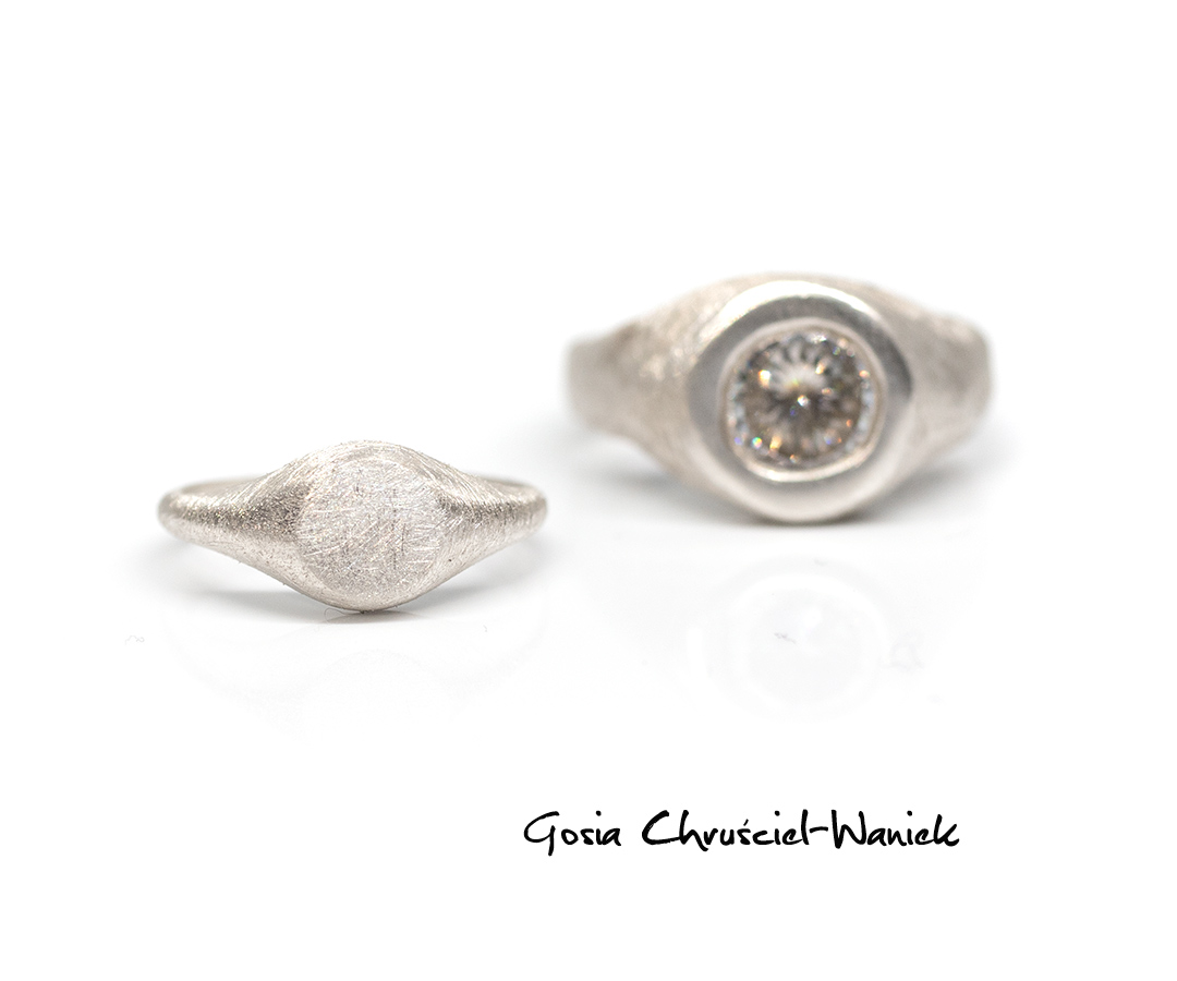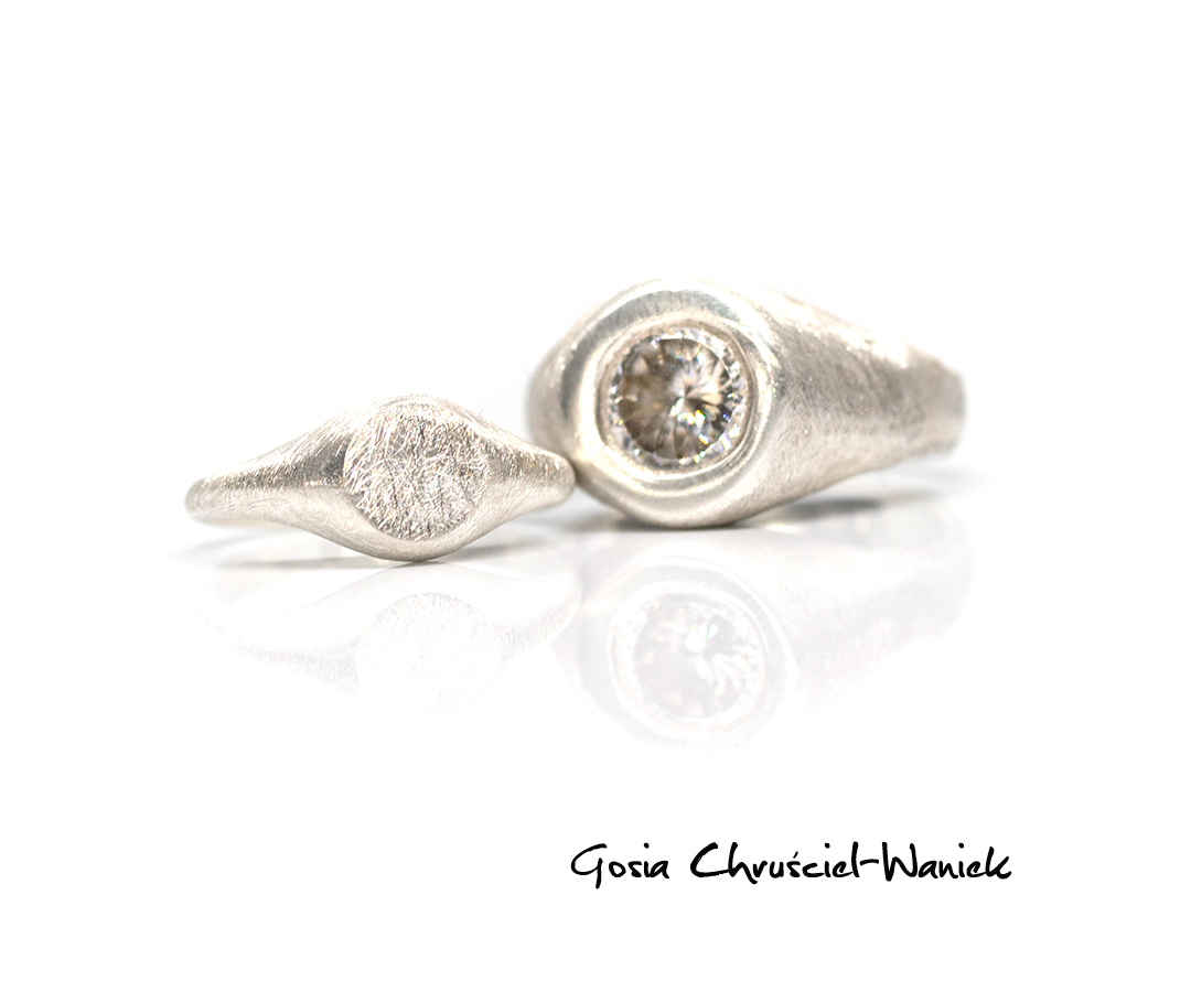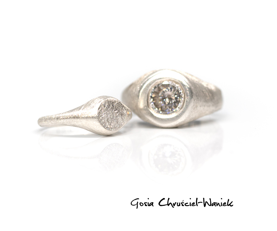 Sygnet wykonany ze srebra. Mocno satynowany, minimalistyczny. Średnica tafli ok 7mm, szerokość z przodu maksymalnie 8mm, z tyłu 2mm.