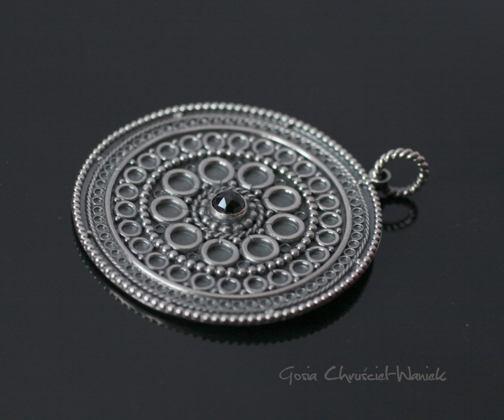 Niezwykle efektowny i pracochłonny wisior nawiązujący formą do Mandali – motywu artystycznego występującego głównie w sztuce buddyzmu. Wielogodzinne tworzenie mandali jest rodzajem medytacji.