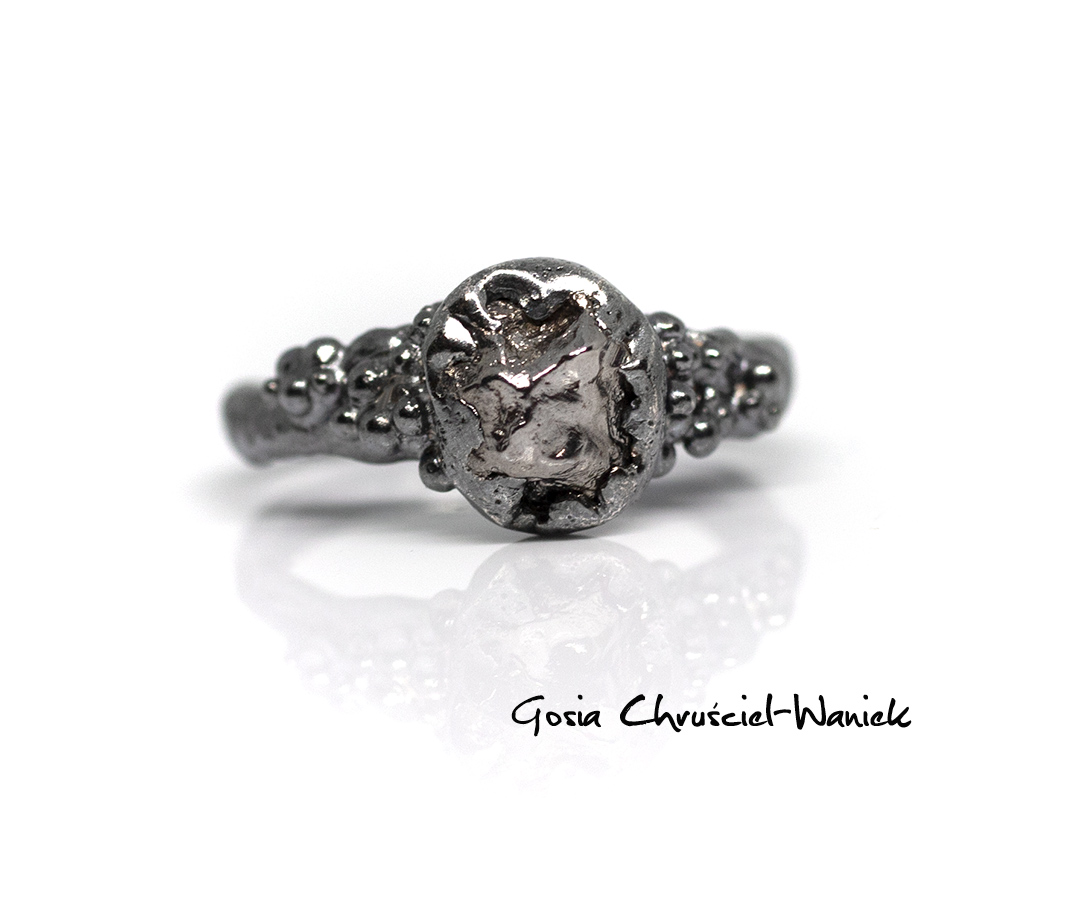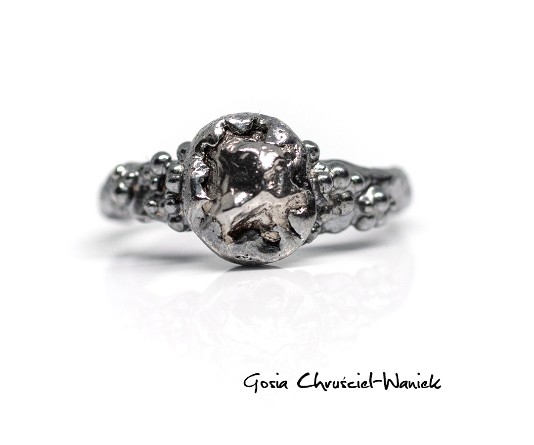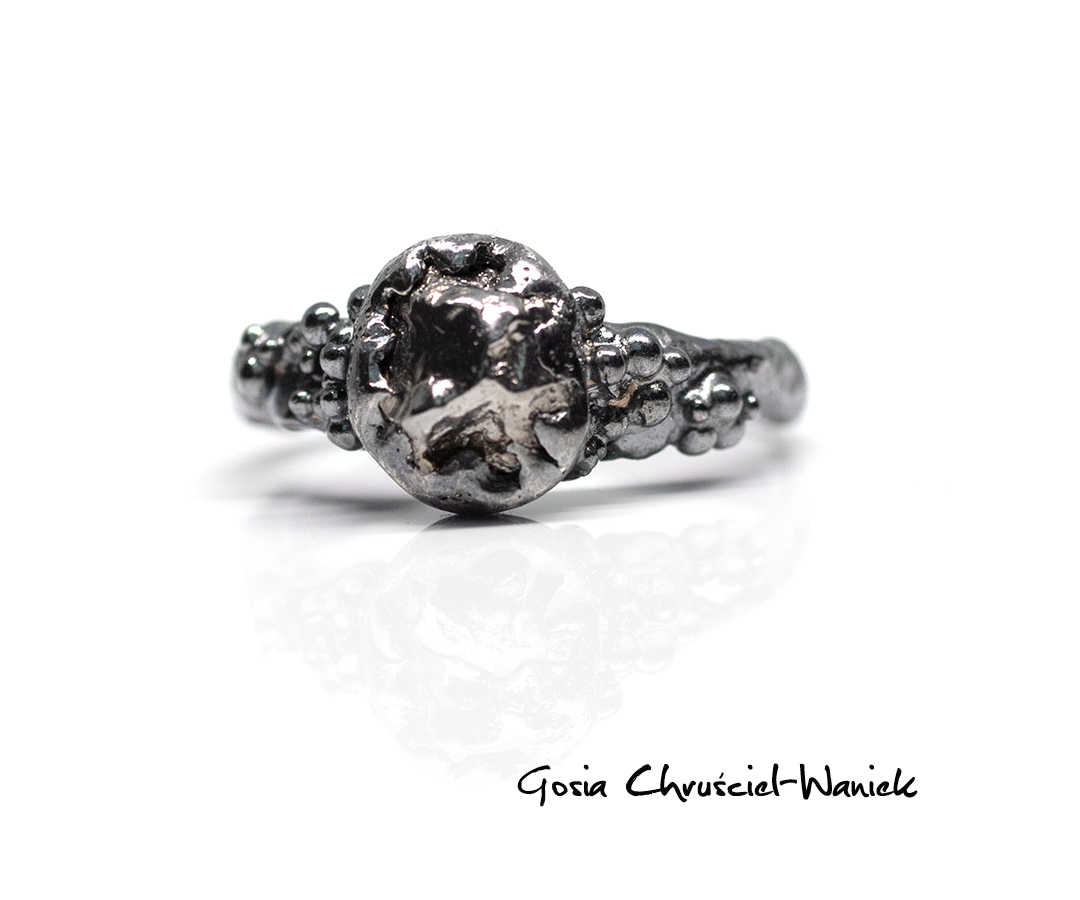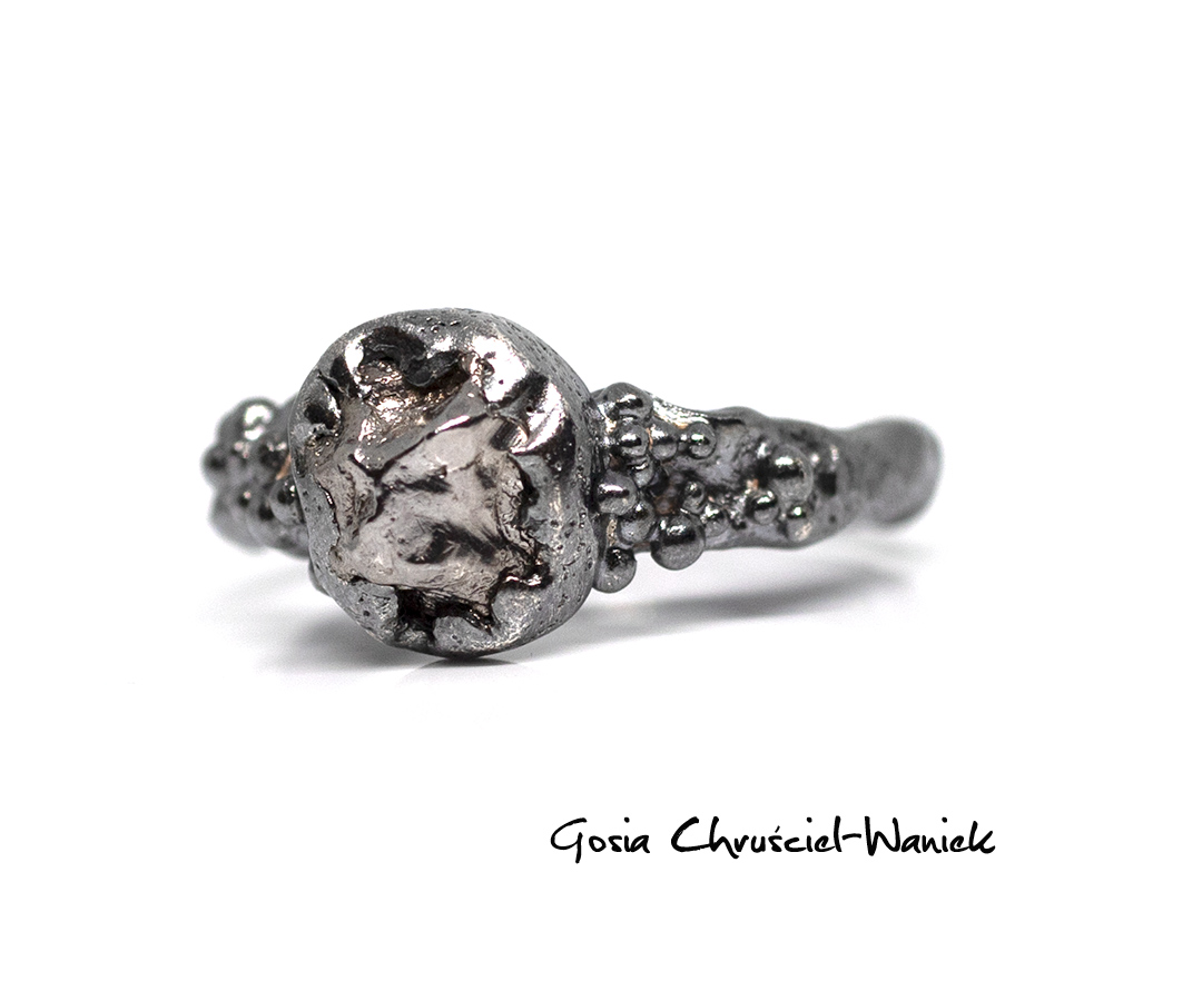 Pierścionek wykonany ręcznie ze srebra pr. 925 z meteorytem Campo del Cielo.