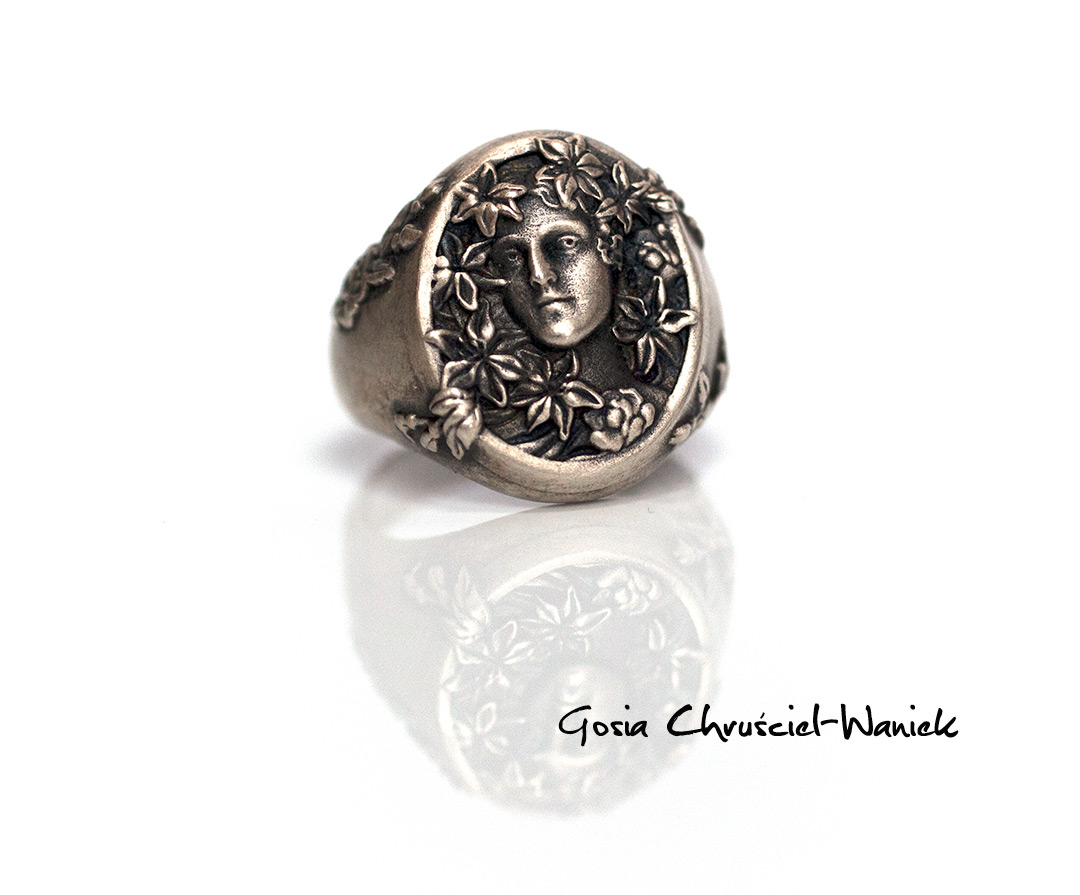 Sygnet z kolekcji inspirowanej pracami Alfonsa Muchy wykonałam w srebrze pr. 925.