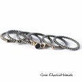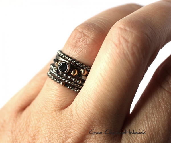 Praca na zamówienie. Zestaw pierścionków wykonanych ze srebra pr. 925 i 999, złota pr. 585 z czarnym szafirem oraz białą cyrkonią. Praca oksydowana. Rozmiar pojedynczych pierścionków 14.