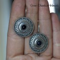 Kolczyki wykonane w ręcznie ze srebra pr.925 i 999 oraz naturalnych szafirów o średnicy 6mm. Kamienie zostały ubrane przeze mnie w ażury i kuleczki. Długość całkowita kolczyków ok 3,6cm. ¦rednica kół ok 2,2cm. Waga pary 11,1g. Praca została zoksydowana, przetarta i wypolerowana. Kolczyki będzie można kupić w październiku.