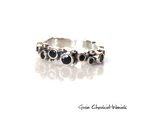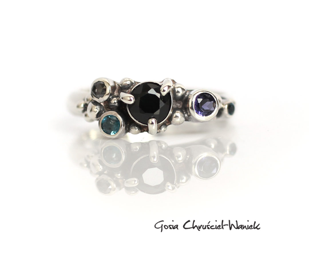Pierścionek wykonany na zamówienie ze srebra pr. 925 z czarnym szafirem o średnicy 5mm, iolitem o średnicy 3mm, topazem London Blue o średnicy 2,5mm i 1,5mm oraz z rozetą diamentową o średnicy 2mm.