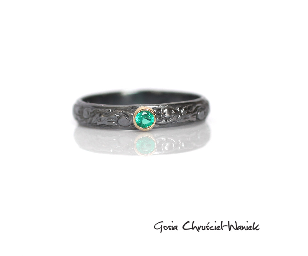 Pierścionek wykonany ze srebra pr. 925 (obrączka), złota pr. 585 (oprawka) z hydrotermalnym (hodowanym) szmaragdem o średnicy 2,75mm.