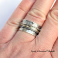 Obrączka wykonana na zamówienie ze srebra pr. 925, złota pr. 585 (młótkowana obrączka nałożona na szeroką, tłoczoną obrączkę) z brylantem szampańskim o średnicy 1,7mm.
