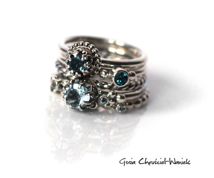 5 pierścionków wykonanych ręcznie ze srebra pr. 925 z topazami Sky Blue i London Blue.