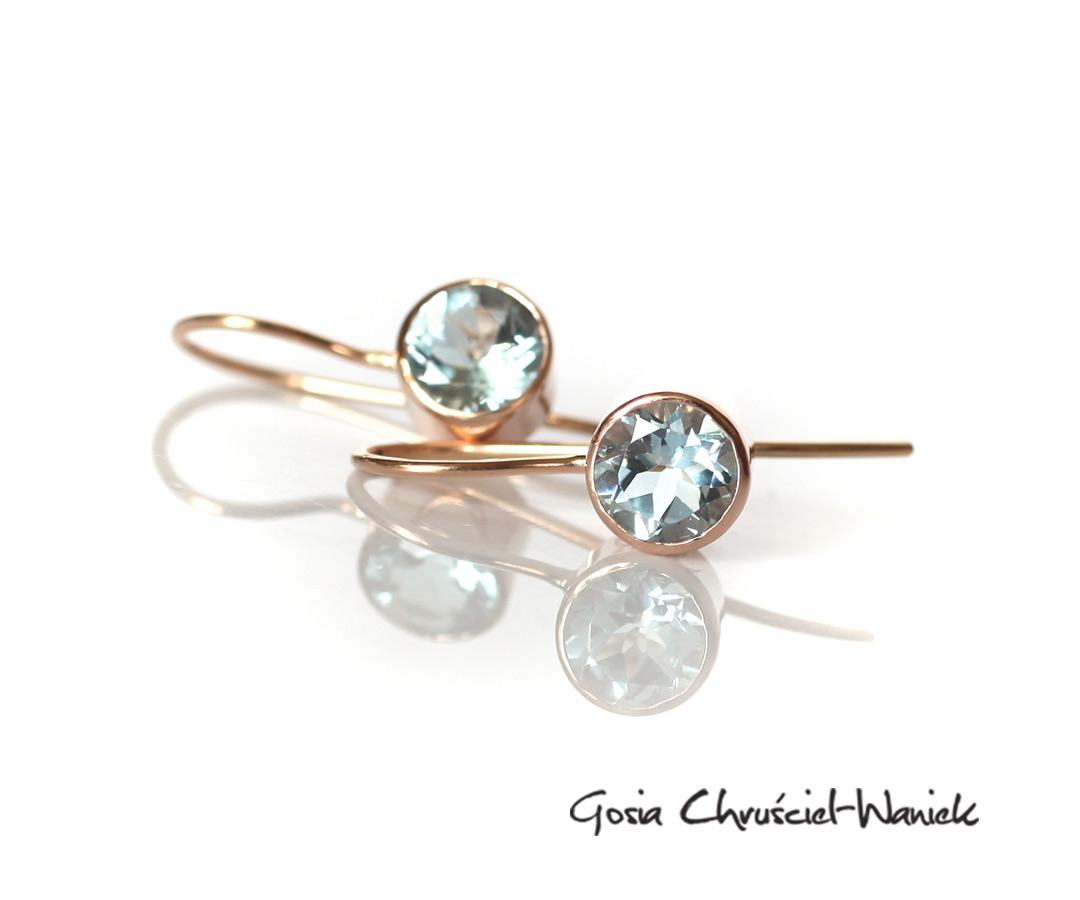 Kolczyki wykonane na zamówienie z różowego złota, ozdobione topazami Sky Blue o średnicy 8mm.