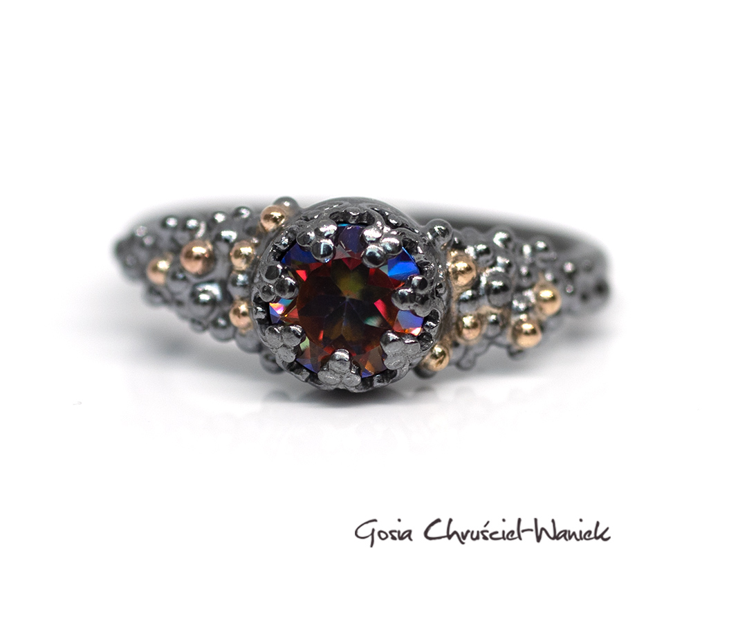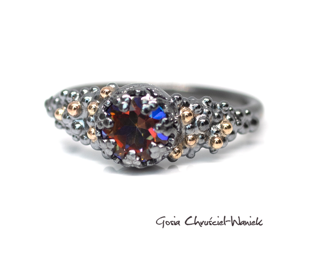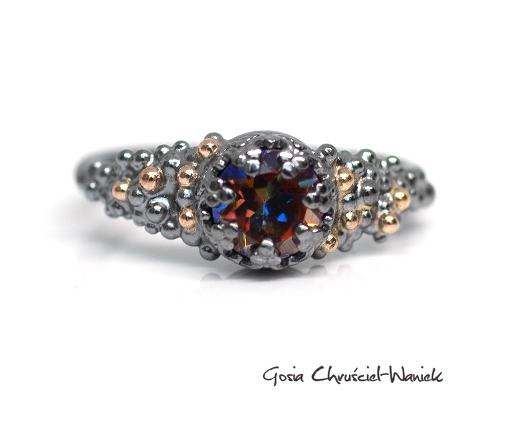 Pierścionek wykonany ręcznie ze srebra pr. 925 z zachwycającym topazem mistycznym o średnicy 6mm. Pierścionek ozdobiony dodatkowo złotymi kuleczkami.