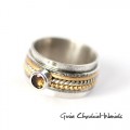 Praca na zamówienie. Pierścionek wykonany ręcznie ze srebra pr. 925 oraz kwarcu „Whisky” o średnicy 5mm. Wysoka obrączka została ozdobione przeze mnie cienkimi obrączkami o różnej fakturze w tym dwoma złoconymi. Praca oksydowana i polerowana Rozmiar jubilerski 18.