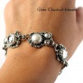 Bransoleta wykonana ręcznie ze srebra pr. 925 i 999, słodkowodnych pereł oraz białych cyrkonii. Największa cyrkonia oraz dwie 5mm to briolety o szlifie szachownicy, pozostałe mają 1,5mm i 2mm średnicy. Każdy element bransolety jest unikatowy. Bransoleta została zoksydowana i wypolerowana. Długość ok 19cm, bransoleta zostanie dopasowana do obwodu nadgarstka.