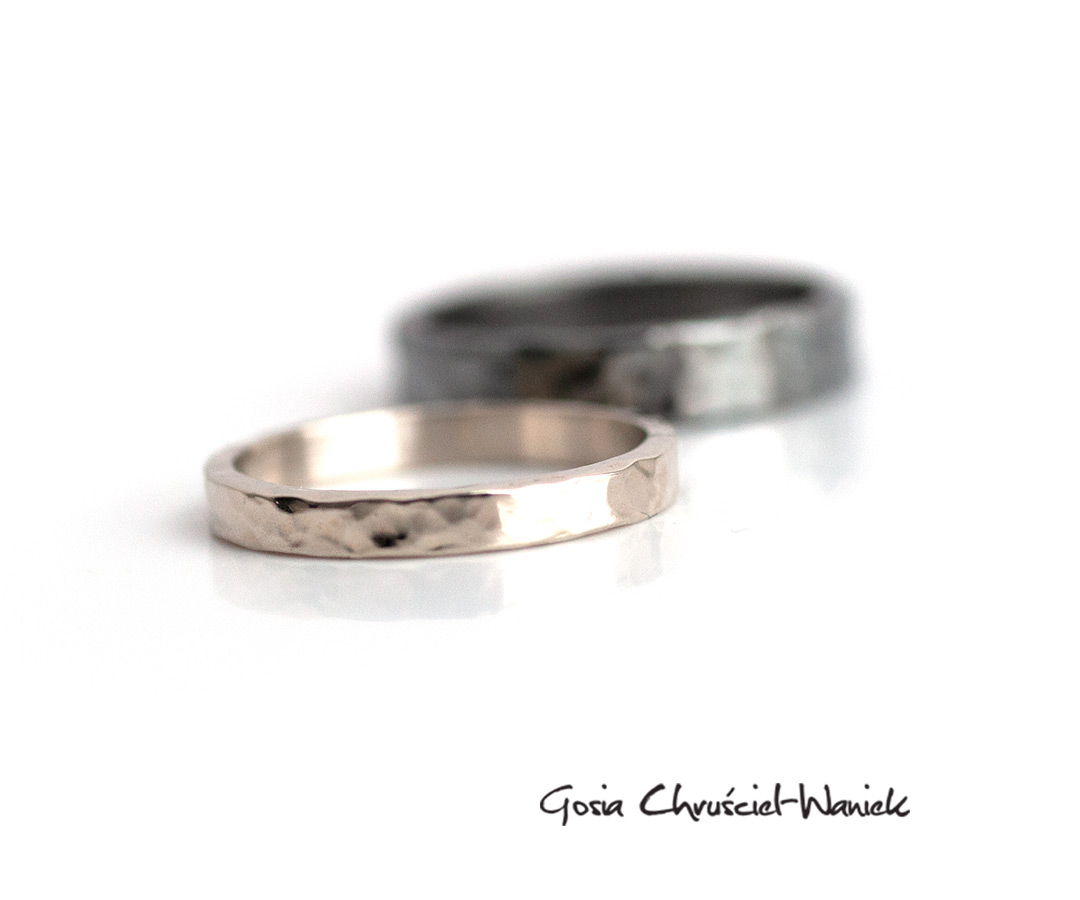 Obrączki ślubne wykonane ręcznie na zamówienie. Męska została wykonana ze srebra pr. 925, oksydowana. Damska została wykonana z białego złota pr. 585.