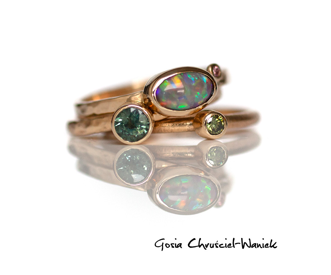 Pierścionek wykonany ręcznie ze złota pr. 585 z pięknie opalizującym owalnym opalem australijskim i bardzo rzadkim różowym brylantem o średnicy 1,5mm. Opal ma wielkość ok 8mm x 5mm.